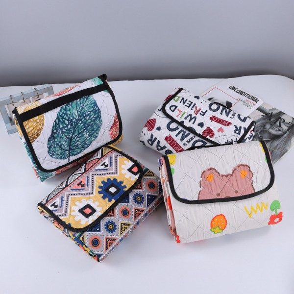Custom picnic blankets are made of printed pongee fabric and waterproof oxford fabric, which with its tight weave and durable texture, ensures the mat resists wear, tearing, and light moisture-ideal for outdoor use on grass or uneven ground. It accepts various acustomization methods, like digital printing, embroidery, or screen printing, allowing personalized designs such as brand logos, or unique patterns to maintain clear colors and not fade easily after washing. Additonally, the back of  oxford fabric was finished by PU coating, which serves as a reliable waterproof barrier. This coating effectively blocks moisture from the ground (such as dew on grass, light rain, or damp soil) from seeping through to the top surface, keeping the mat dry and confortable fro sitting or placing food. You just need to provide your own design artwork if you want to custom it.